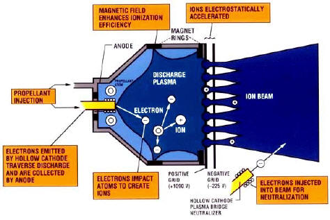 En vez de hacer esto mediante combustibles químicos, este mecanismo de propulsión consiste en dar una carga eléctrica a un gas. Acto seguido, los iones son acelerados eléctricamente hasta una velocidad de 30 Km/s, formando un jet azulado que es expulsado a gran velocidad del motor. Cuando los iones son emitidos a tal velocidad desde el vehículo, empujan a éste en dirección opuesta, tal como describe la ley de acción y reacción.