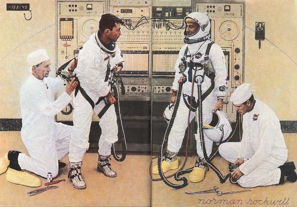 Aquí vemos una ilustración del genial pintor americano Norman Rockwell, donde aparecen los tripulantes de la misión Géminis III, Gus Grissom y John W. Young.