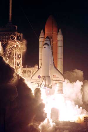 El transbordador, sus cinco tripulantes y la nueva cámara «Quest» de descompresión de la Estación Alfa despegaron puntualmente a las (9:04 GMT). Mañana a la noche deben acoplarse.