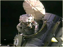 Cuando se cumplían tres horas de caminata, Gernhardt y Reilly treparon hasta el tope de la torre que sostiene los grandes paneles solares para revisar la tensión de las alas repletas de células fotoeléctricas, el estado de un motor que ha venido fallando intermitentemente y el de un dispositivo que debe evitar la formación de arcos voltaicos entre los paneles.