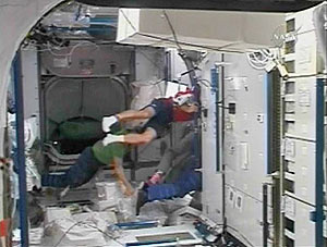 El francés Leopold Eyharts y el alemán Hans Schlegel acceden al interior del laboratorio orbital, cuya instalación aún no está completa.