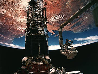 Story Musgrave colgando del brazo robot del Endeavour, de cara al Hubble y en la cima del mundo.