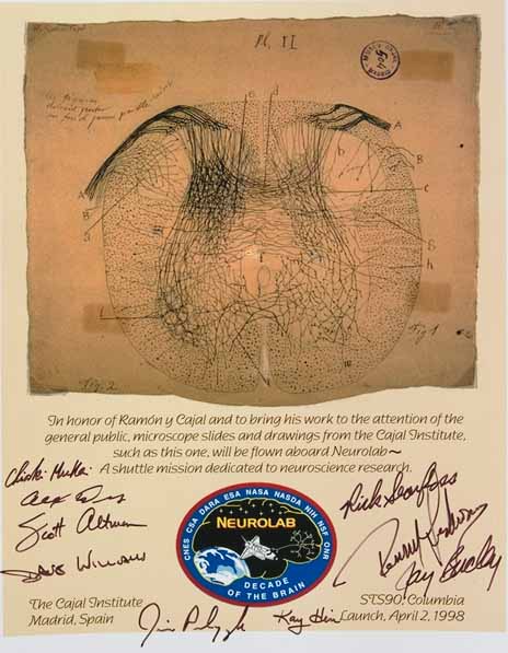 La misión Neurolab ha transportado una pieza fundamental de la historia de la neurociencia. Almacenadas en el transbordador espacial Columbia, han viajado una serie de preparaciones histológicas originales de D. Santiago Ramón y Cajal, padre de la «Doctrina Neuronal», el cual estableció la individualidad de las neuronas como pieza clave en el edificio del Sistema Nervioso. Además, una serie de nuevos dibujos científicos originales de D. Santiago Ramón y Cajal han sido expuestos en el Museo de la NASA durante la misión espacial. Uno de ellos se reproduce en la portada de la memoria y en este panel firmado por los astronautas que formaron parte de la tripulación: Richard searfoss, Scott Altman, Kathryn Hire, Richard Linnehan, Dave Williams, Jay Buckey y James Pawelczyk.