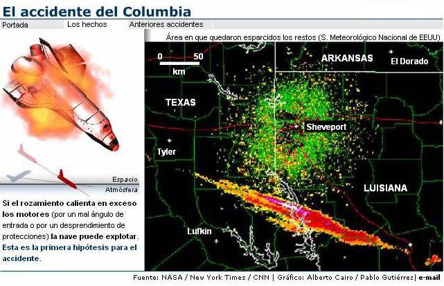 Según las investigaciones, el desastre comenzó poco después de que el transbordador ingresara sobre territorio continental de EEUU desintegrándose totalmente a una altura de unos 60 kilómetros sobre el estado de Texas.