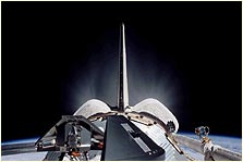 Bajo esas cubiertas, que sobresalen como jorobas a los lados del timón de dirección, se alojan los motores, tanques de combustible y toberas de escape del sistema impulsor más poderoso con que cuenta el transbordador para ejecutar maniobras altamente críticas una vez en órbita.